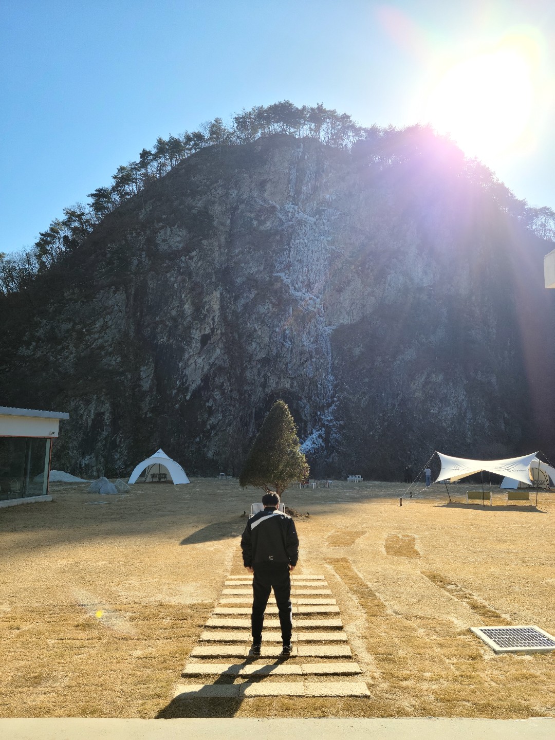 몇걸음 더 들어가면 한중간에 나무 한 그루가 있고, 옆으로는 잔디밭이에요. 겨울이라 잔디가 푸르르진 않지만 화롯불이 있고, 군데군데 놓인 텐트가 운치 있었습니다. 나와서 따뜻한 커피 마시는 기분이 여유롭습니다.