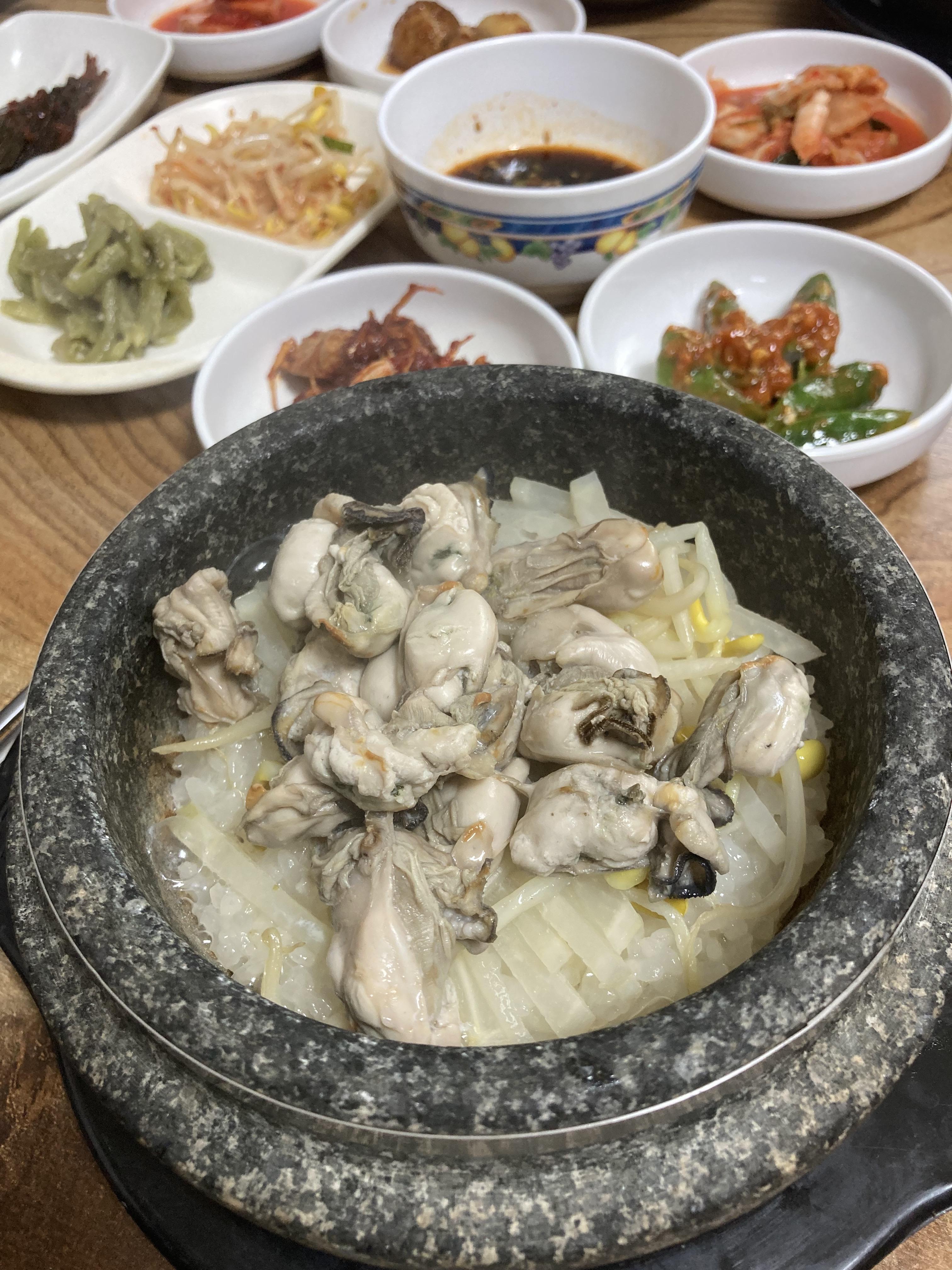 저희는 2인 추천 세트인 4만원 코스를 먹었어요. 코스에 굴밥과 젓국 갈비가 밑반찬과 함께 나옵니다