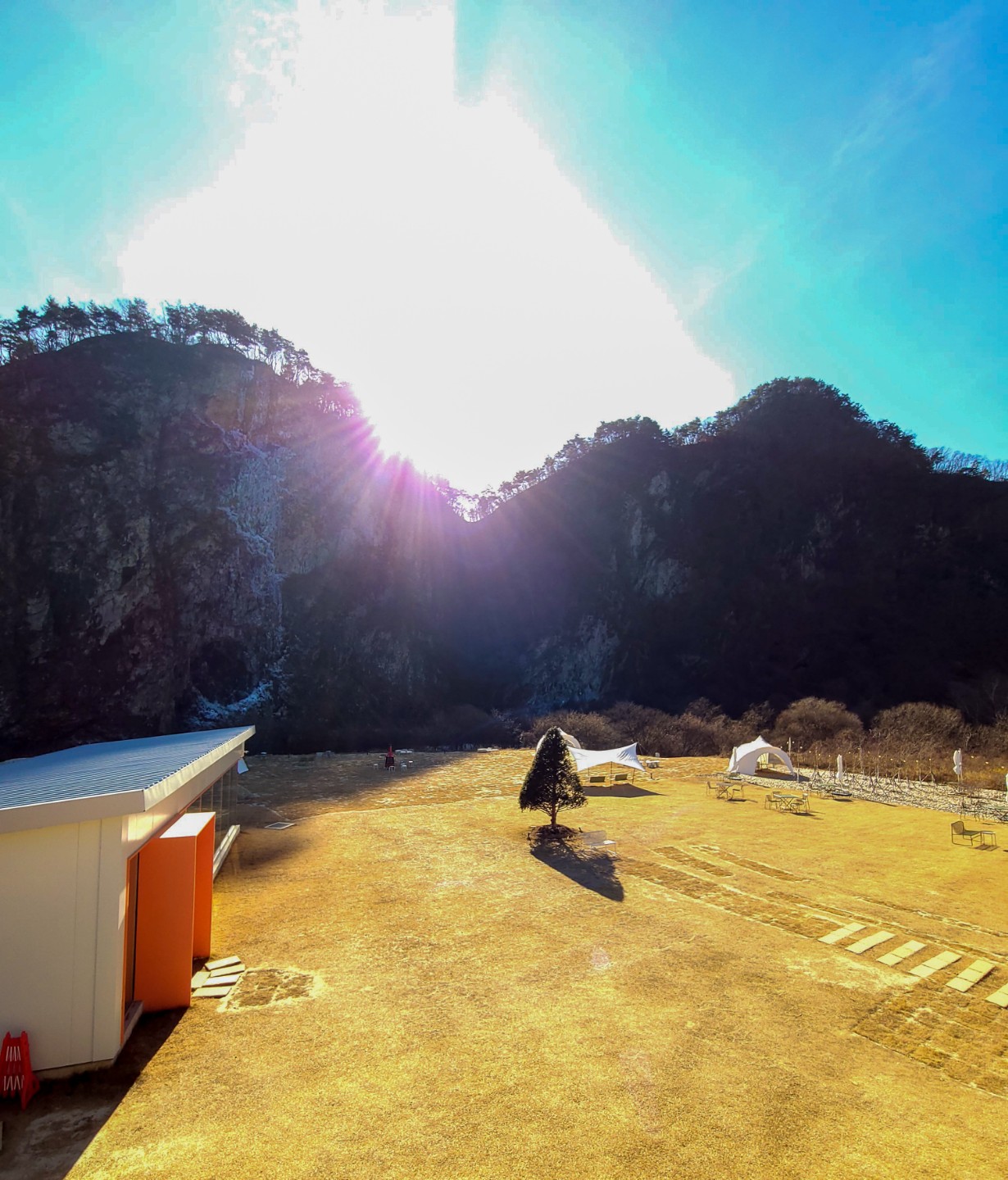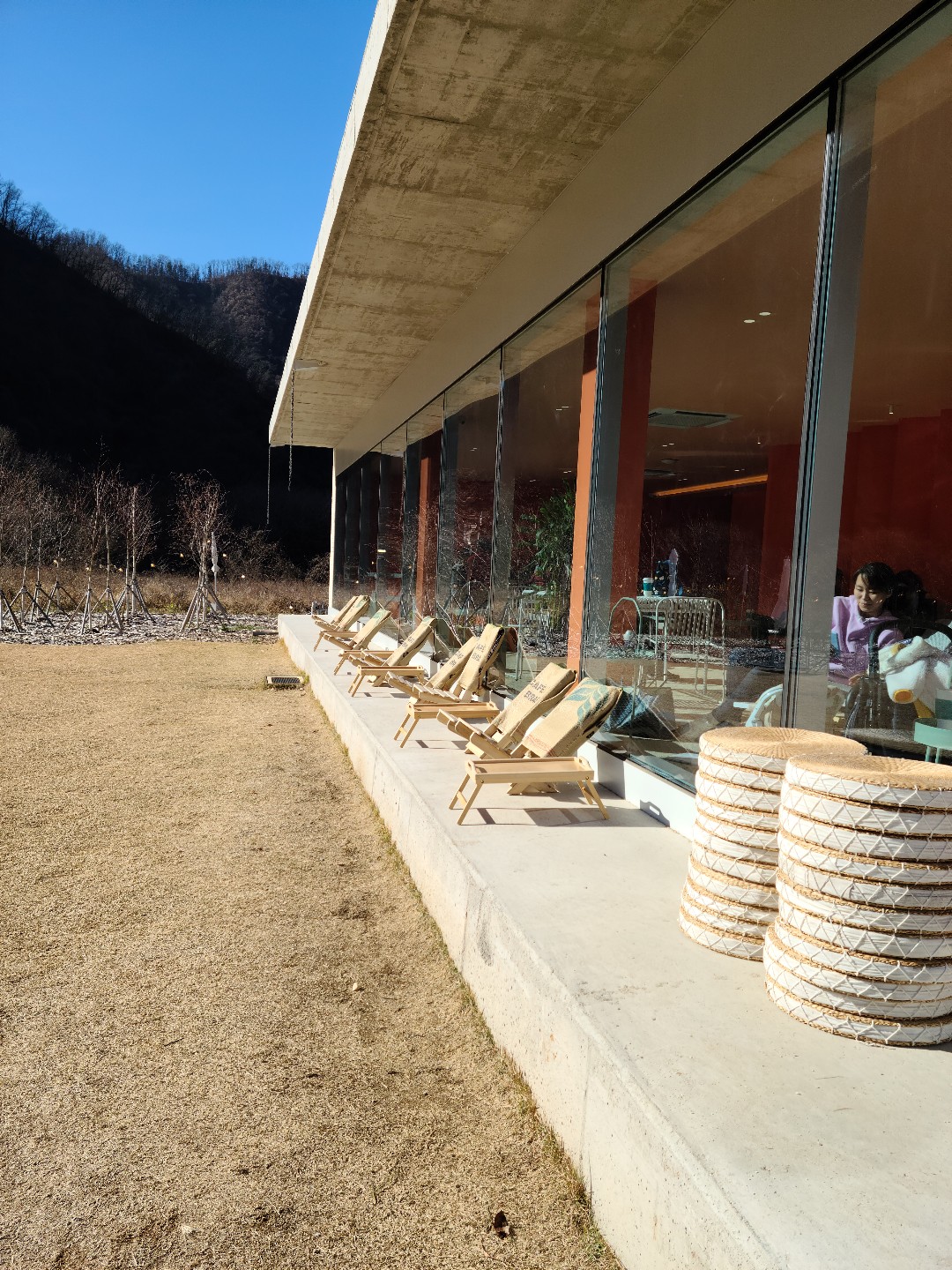 몇걸음 더 들어가면 한중간에 나무 한 그루가 있고, 옆으로는 잔디밭이에요. 겨울이라 잔디가 푸르르진 않지만 화롯불이 있고, 군데군데 놓인 텐트가 운치 있었습니다. 나와서 따뜻한 커피 마시는 기분이 여유롭습니다.