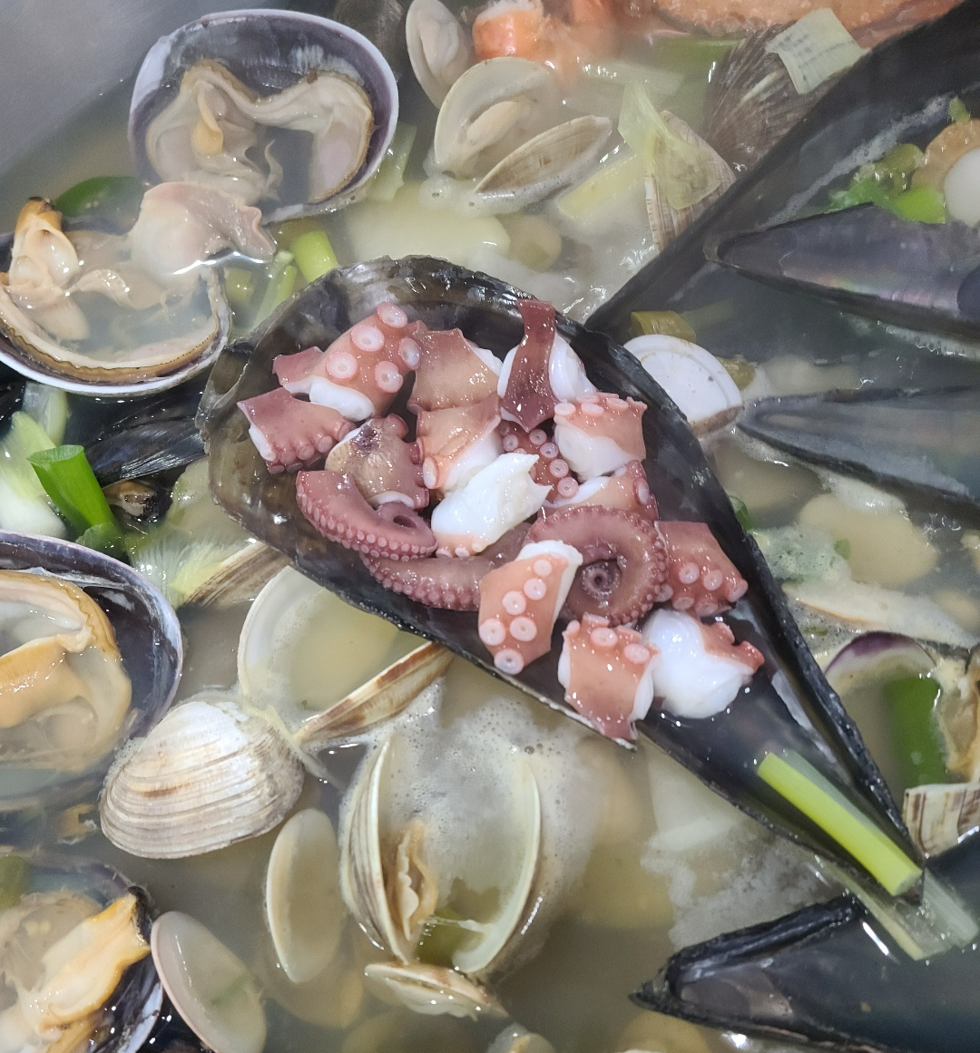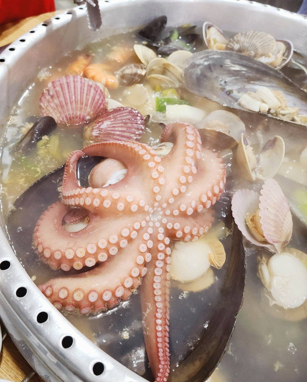 오 나오자마자 탄성. 우와 비주얼이 남다르다. 일단 큰 솥도 솥이지만, 그 안에 든 내용물이 엄청 실하다. 가격은 소짜 하나에 4만원대. 이곳은 다시 올 만한 곳이라는 생각하면서 솥뚜껑을 닫고 해산물이 익기를 기다리고 있는데, 지인 한명이 갑자기 문어를 하나 추가하자고 해서 솥 하나에 문어 추가했다. 이모님이 오셔서 문어를 쓱 넣고 솥뚜껑을 닫았는데 문어여서 다시 열고 찍기 쉽지 않았다. 이미 뜨거워서 움찔거리는 모습이 좀 안쓰러운 마음이 슬금슬금 올라왔다. 그러나 그 마음도 잠깐. 다시 뚜껑 닫고 먹을 준비 완료
