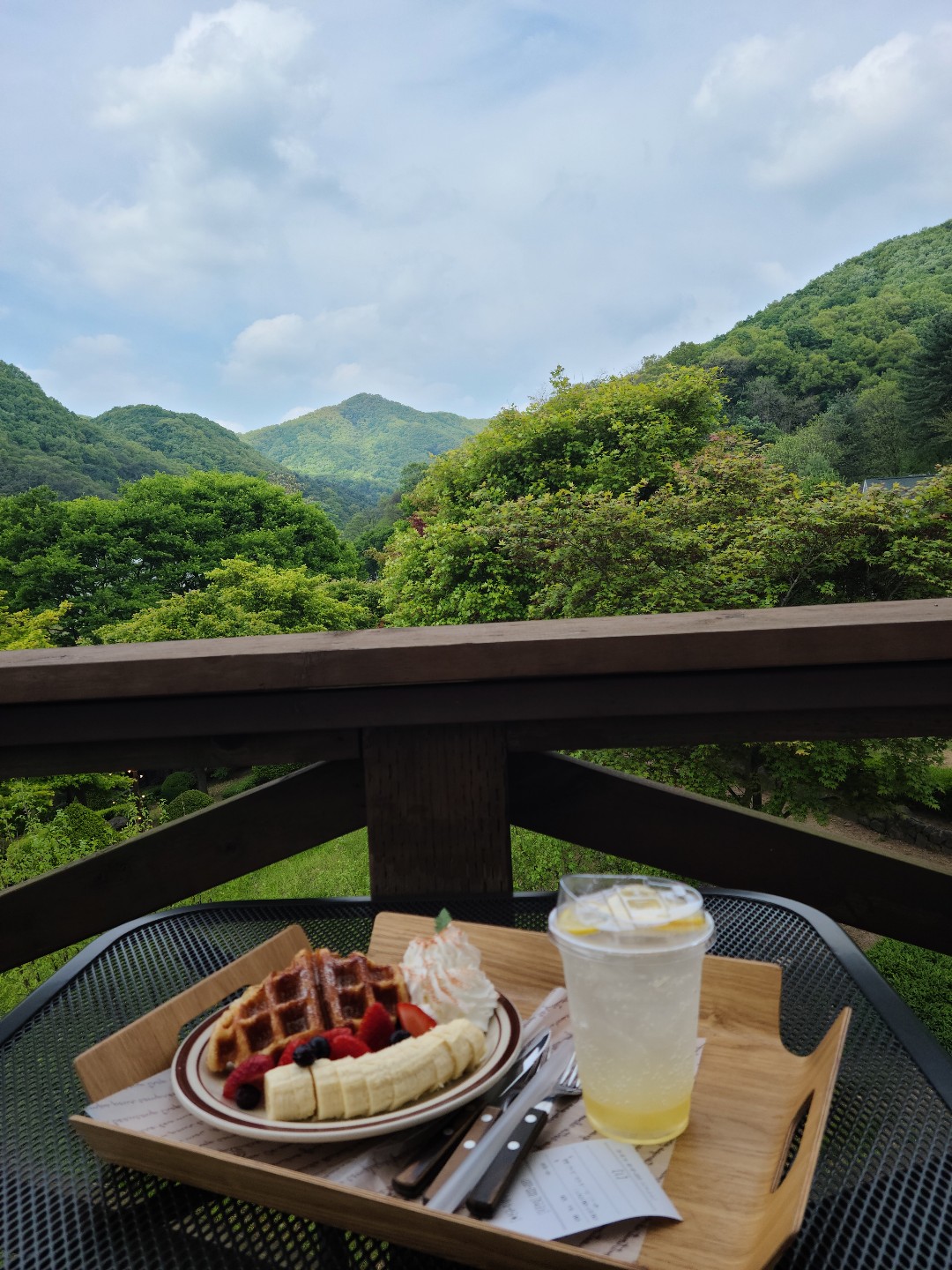 카페 2층에서 찍은 전경입니다. 너무 멋있죠. 카페 근처로는 손질된 나무들과 잔디들이 있고, 그 주변으로는 자연 그 자체를 즐기실 수 있어요